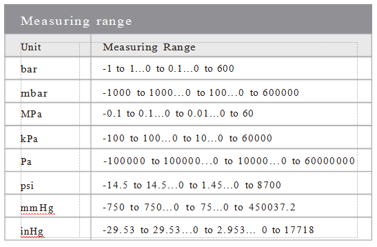 | Range | -1-0-1…600 bar (Customizable) | |||||